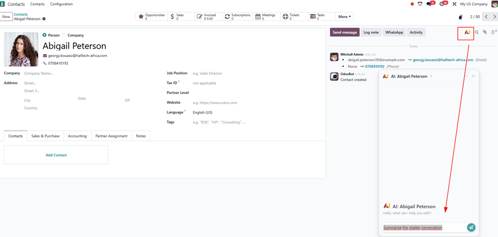 Beispielsweise im Modul Kontakte erscheint ein kleines AI-Logo oben rechts im Chatter – ein sichtbares Zeichen dafür, dass Odoo hier neue Funktionen einführt.