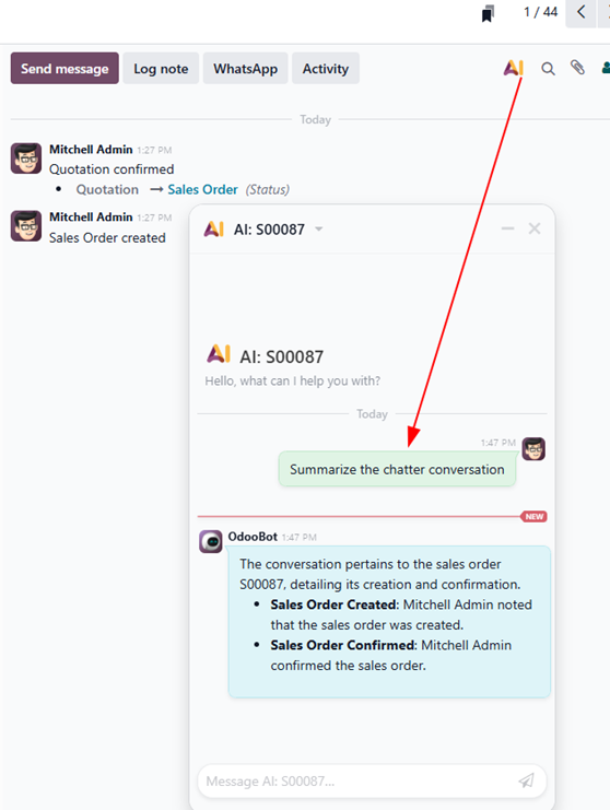 Bereits in der aktuellen Odoo 18.4-Version im Runbot sind erste Anzeichen sichtbar: Der Chatter erhält intelligente Funktionen! AI wird also zum Standard!