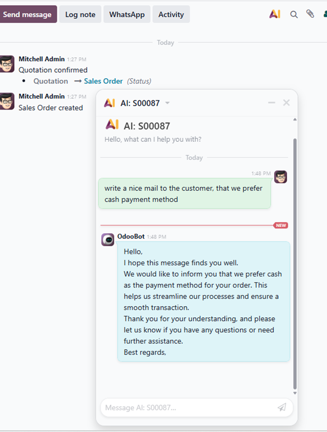 Auch die Einführung der AI in der Verkauf-App zeigt, dass Odoo den Arbeitsalltag im Vertrieb ebenfalls erleichtern könnte. Neben Automatischen Zusammenfassungen unterstützt die künstliche Intelligenz auch bei Formulierungen. Das ist an nachfolgendem Beispiel ersichtlich.